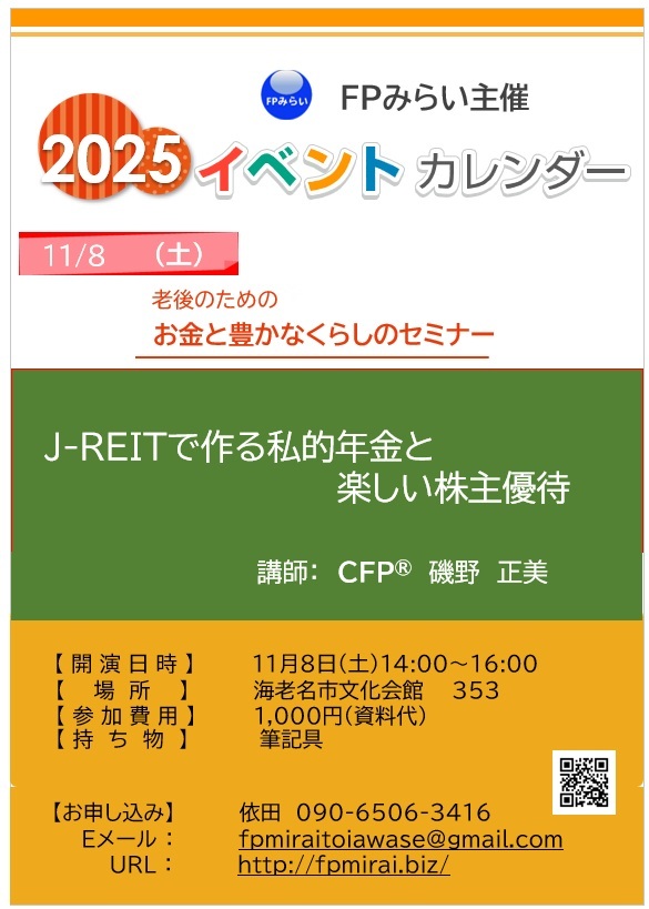 11月8日(土)海老名市文化会館にて、FPみらい主催の老後のためのお金と豊かなくらしのセミナー「-REITで作る私的年金と楽しい株主優待」 を開催しました。参加者は広報えびなをご覧になっての方々でした。